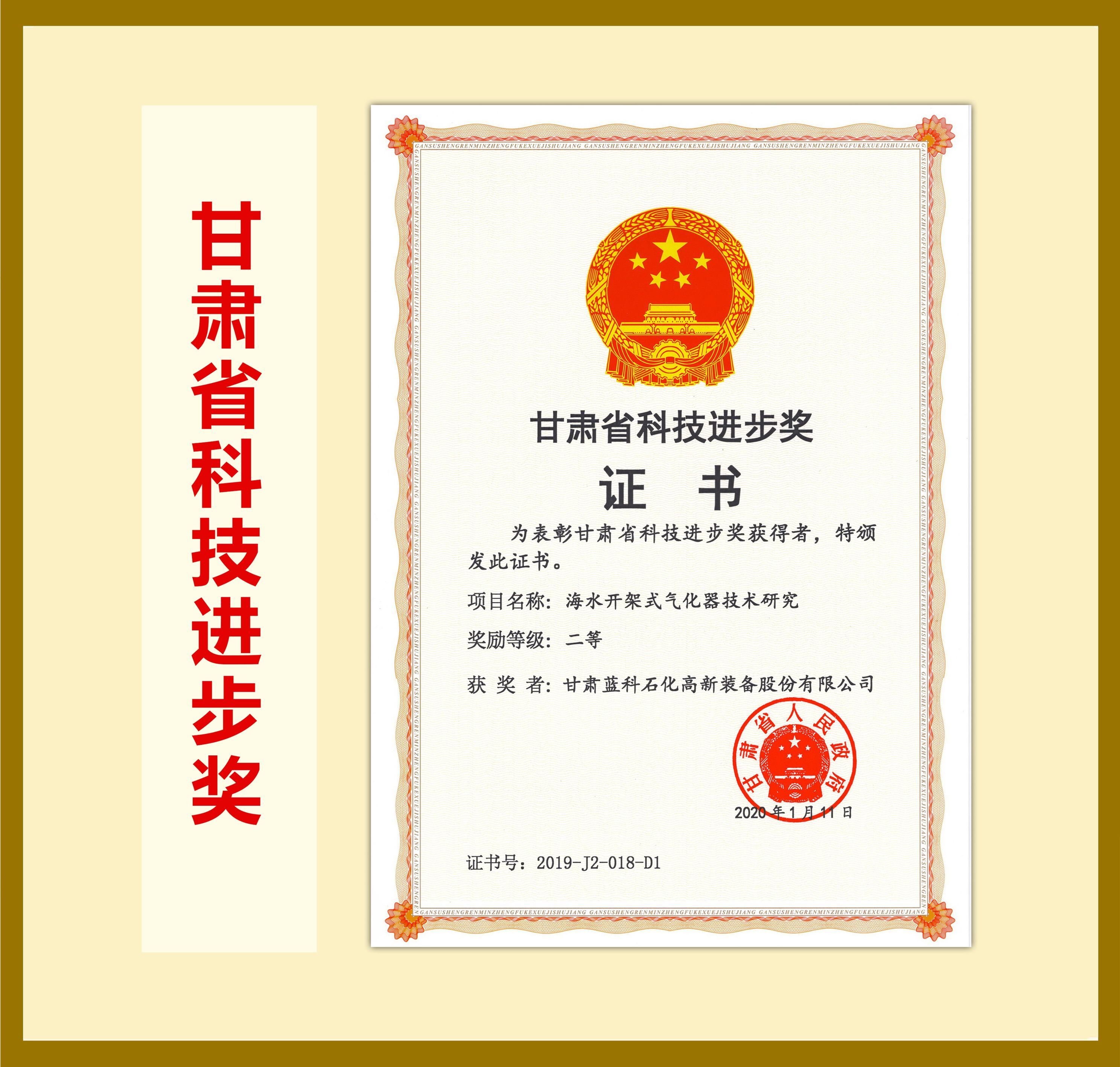 海水開架式氣化器 甘肅省科技支撐計劃 甘肅省科技進步二等獎
