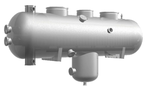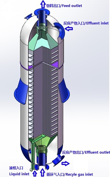 循環換熱分離器應用于煤制油裝置費托合成單元,將來自反應器的高溫油氣經與循環氣換熱冷卻并分離,分離后的液相重質油經加熱后送至汽提塔,分離后的氣相高溫油氣進入油氣空冷器冷卻。循環換熱分離器整合了板殼式換熱器高效傳熱與高效分離器高精度分離技術,采用防堵塞專用板型,傳熱效率高、分離精度高、傳熱與分離功能二合一,節省占地與配管空間。循環換熱分離器為首創產品,依托400萬噸/年煤間接液化成套技術創新開發及產業化項目榮獲2020年度國家科學技術進步一等獎。